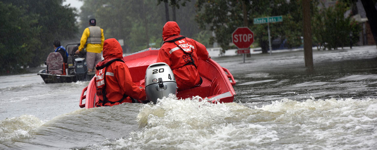 A rescue boat motors down Houston’s flooded streets following Hurricane Harvey.