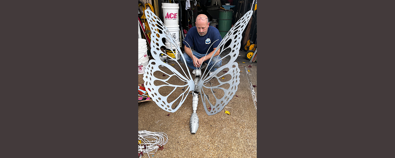 Some pieces have a personal connection, like the three-foot-tall heart he made for the hospital that treated him after he had a heart attack. Or the butterfly that he donated to his temple’s garden, which grows food to donate to those in need. Standing 14 feet tall and with a bench around it, which he crafted from reclaimed skids, the butterfly can be seen from anywhere in the garden.