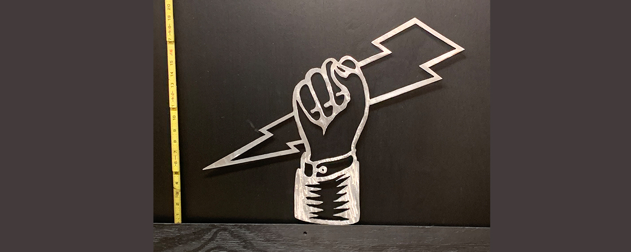 In keeping with his love of his day job, Siegel even crafted a fist holding a lightning bolt and two others with “FGE” — the initials of his employer, Fred Geller Electric. One of the FGE pieces, done a few years ago, was inspired by a conversation Siegel had with an apprentice.
