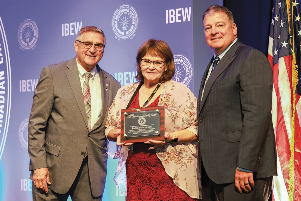 Arlington, Texas, Local 220’s Jedon Shinpaugh also was honored at the conference. In 2024, Shinpaugh — then a shop steward at the Siemens USA facility in Grand Prairie — worked hard to help get workers at a sister Fort Worth facility to vote overwhelmingly in favor of IBEW representation. The Professional & Industrial Organizer of the Year is now a staff organizer at Local 220, where she’s working on bringing in hundreds more Siemens workers.