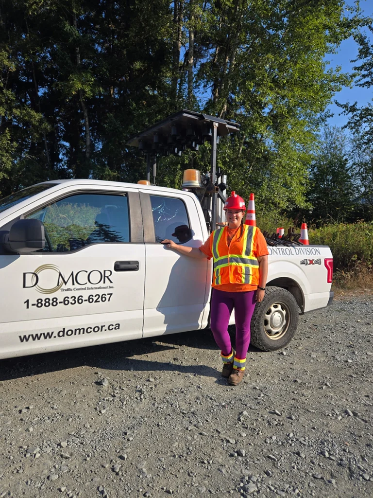 Domcor traffic control employees assist IBEW members from BC Hydro during work on Vancouver Island. The Domcor employees voted to become members of Vancouver Local 258. Pictured by truck is Domcor traffic control employee Vanessa Cobbs.