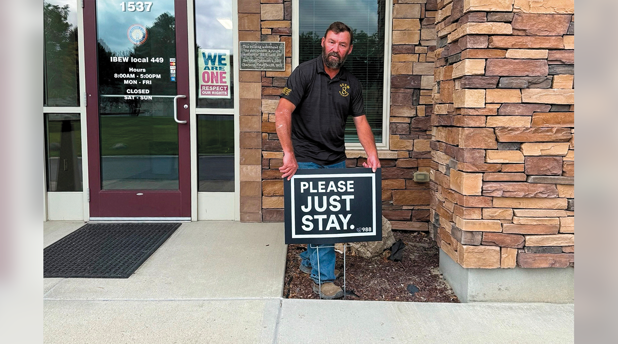 I want to thank Local 449 and Business Manager Clay Hirning for allowing me to put up the “Please Just Stay” sign in front of our building. I feel strongly about this movement as a survivor of suicide loss. I want us all to remember that tomorrow needs everyone. We all have something to contribute. There is hope in the darkness. We all need to look after one another.