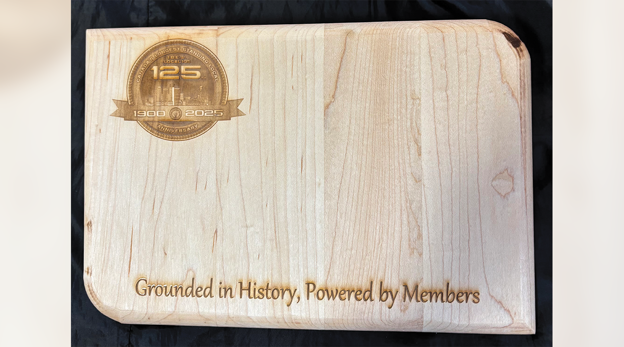 RETIREES’ CLUB OF L.U. 105, HAMILTON, ON — Our retirees’ club was honored to receive an invitation to the local’s 125th anniversary celebration. It was truly a wonderful commemoration. Our heartfelt thanks go out to Local 105 and Lucy Moretti and her team. Together they created unique centrepieces for the tables, a lamp featuring an old-fashioned light bulb they built with their own hands. Additionally, each attending member received a handsome cutting board designed with the Local 105 125th emblem and “Grounded in History, Powered by Members” stamped across the bottom. It was such an honor to be included in this memorable event!