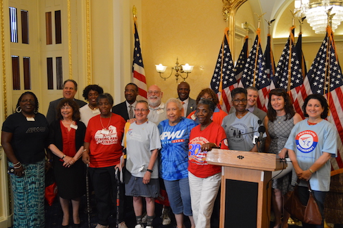 Susan Flashman, a retired member of Washington, D.C. Local 26, spoke about the GOP health proposal to members of the U.S. Senate on June 20. She is joined here by Sen. Chris Van Hollen of Maryland, Sen. Bob Casey of Pennsylvania and Sen. Maggie Hassan of New Hampshire.
