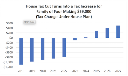 In releasing their plan, Republicans pointed to a fictional family of four who earned $59,900 per year. That family, they said, would receive an $1,182 break on their 2018 taxes under the new plan. But David Kamin, a law professor at New York University, did the math and found that, over time, even that idealized middle-class family would end up paying more in taxes – almost $500 more per year – a decade from now. “This is even as tax cuts for those at the top are maintained,” he wrote.