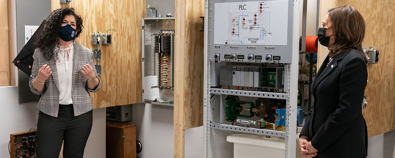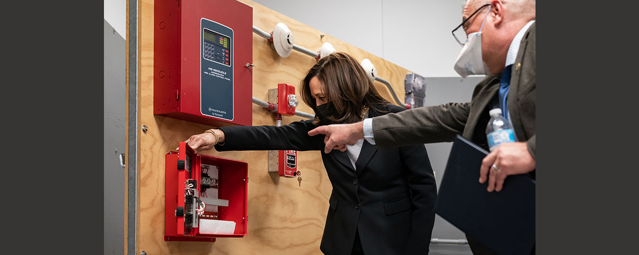 Local 490 Business manager Marco Lacasse explains the workings of an electric fire pump controller to Vice President Harris during her visit to the local on April 23. Photo provided by the White House.