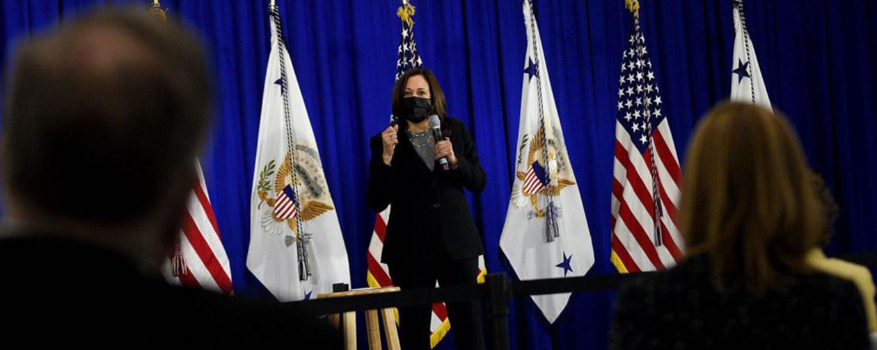 Vice President Kamala Harris addresses a socially-distanced, masked audience during her visit to Dover, N.H., Local 490 on April 23.