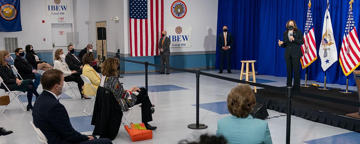 Vice President Kamala Harris praised the IBEW’s apprenticeship programs and said they are a key part of the Biden administration’s American Jobs Plan, which she promoted during a visit to Dover, N.H., Local 490 on April 23.