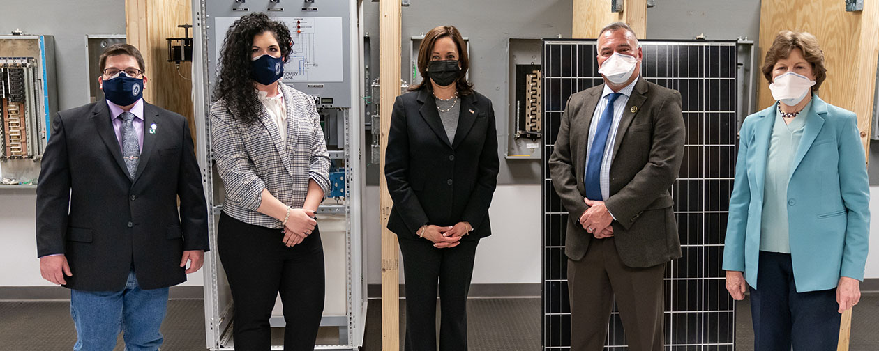 From left, Local 490 training director Eric Batchelor, Local 103 member and wireman Haley Kameralis, Vice President Kamala Harris, Local 490 Business Manager Marco Lacasse and New Hampshire Sen. Jeanne Shaheen. Photo provided by the White House.