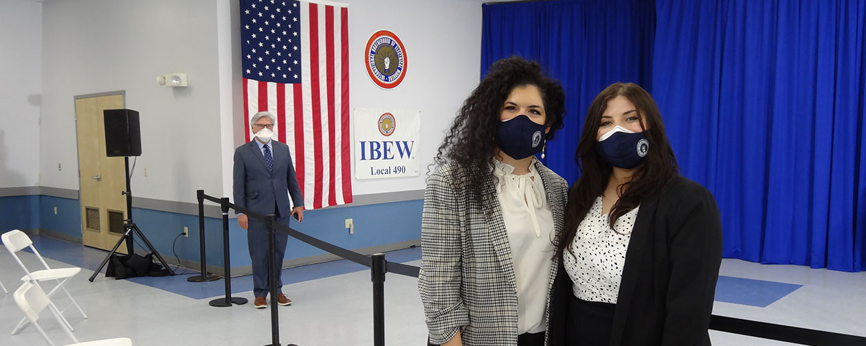 Boston Local 103 member Haley Kameralis, left, and Dover, N.H., Local 490 apprentice Kelli O’Connor after spending time with Vice President Kamala Harris during her visit to Local 490 on April 23.