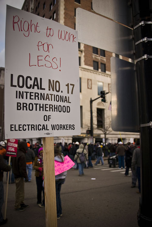 | A sign posted by Detroit Local 17 during a 2012 rally to protest Michigan passing a right-to-work law at that time. IBEW members throughout the state have worked in the decade since to get it repealed. Flickr/Creative Commons photo by Joshua Eller. |