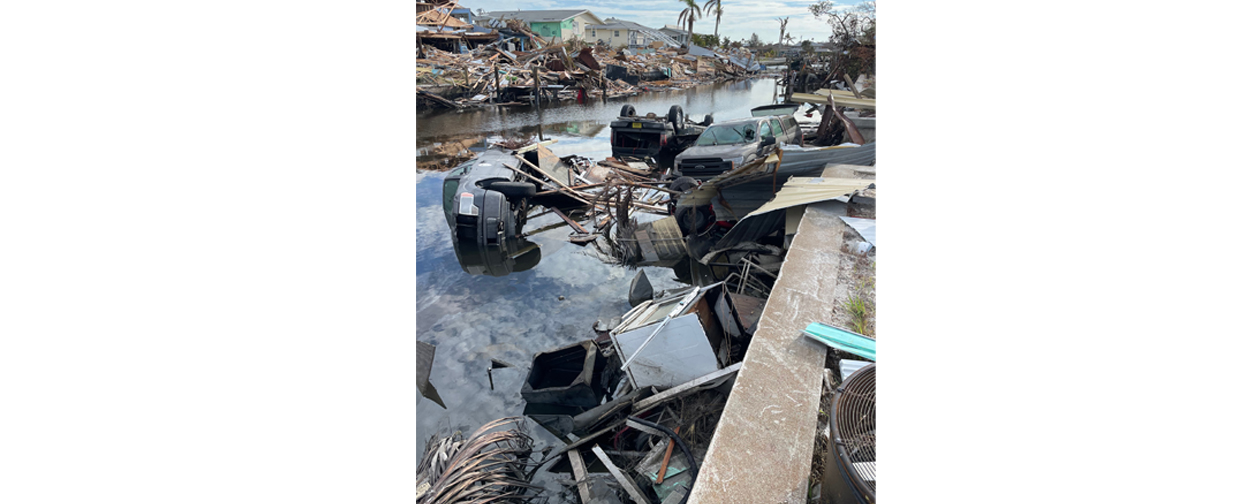 Smashed and overturned cars, boats, and appliances were some of the evidence of Hurricane Ian’s powerful winds and storm surge. Credit: lineman Kellen Lewis, West Palm Beach Local 1191.