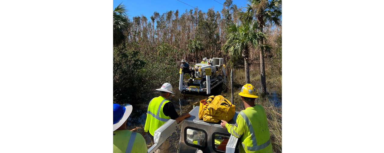 Utility workers head into a Florida swamp in Marsh Master amphibious vehicles. “Fortunately, we didn’t see any alligators or snakes,” said heavy equipment operator Ryan Martin of Atlanta Local 84, who took the photo.