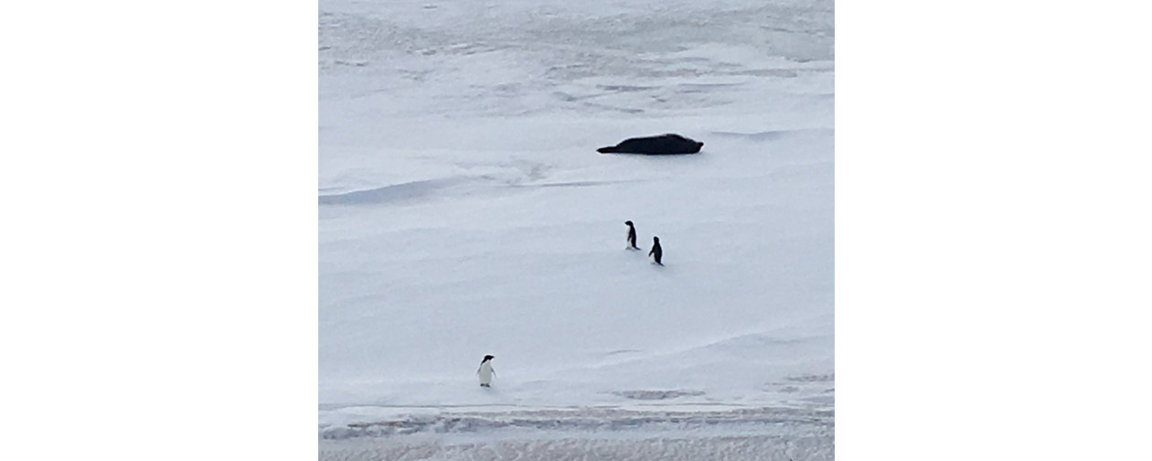 A relaxed seal and playful penguins, a common sight as Local 3 journeyman wireman John Murphy hiked trails above Antarctica’s frozen shore.