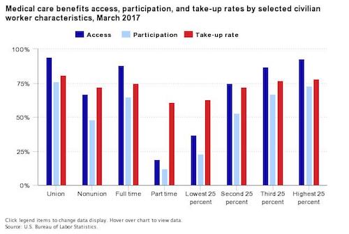 | Union members had a higher access to employee-sponsored health insurance coverage and highest percentage of users of any group in a survey conducted by the Bureau of Labor Statistics. The take-up rate illustrated in red is the percentage of workers with access to a health insurance plan that participate in it. Source: U.S. Bureau of Labor Statistics. |