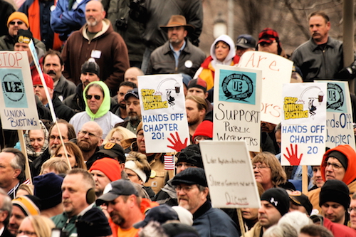 | Defenders of Iowa’s public unions rally at the state capitol opposing changes to Chapter 20, the law allowing public sector workers in the state to organize. |